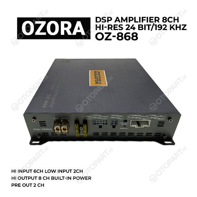 Digital Signal Processor + Amplifier OZORA OZ-08 ( Alat ini adalah DSP 8 channel + power dalam 1 kemasan. Apabila sekarang agan sudah menggunakan power, maka alat ini dapat berfungsi sebagai DSP/Processor saja ). Solusi cerdas untuk meningkatkan kualitas audio mobil standar bawaan mobil anda secara plug n play. Tanpa perlu potong kabel bawaan mobil, sehingga tidak merusak warranty kendaraan sama sekali. Hadirkan suara 3D sound staging & imaging pada kabin mobil anda, Anda bisa bereksperimen dan mengeksplorasi sendiri dengan bebas, untuk menentukan posisi, fokus suara, mengatur frekuensi beserta Time Alignment dengan setting mudah menggunakan PC , dan bisa juga dengan smartphone (BLUETOOTH optional)
